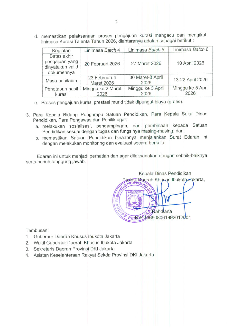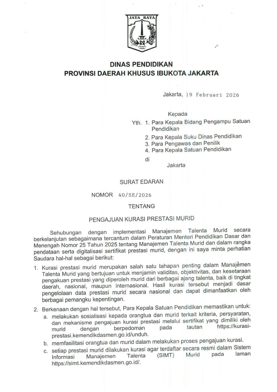 Dinas Pendidikan Provinsi Daerah Khusus Ibukota Jakarta Menerbitkan Surat Edaran Nomor 40/SE/2026 Tentang: Surat Edaran Pengajuan Kurasi Prestasi Murid