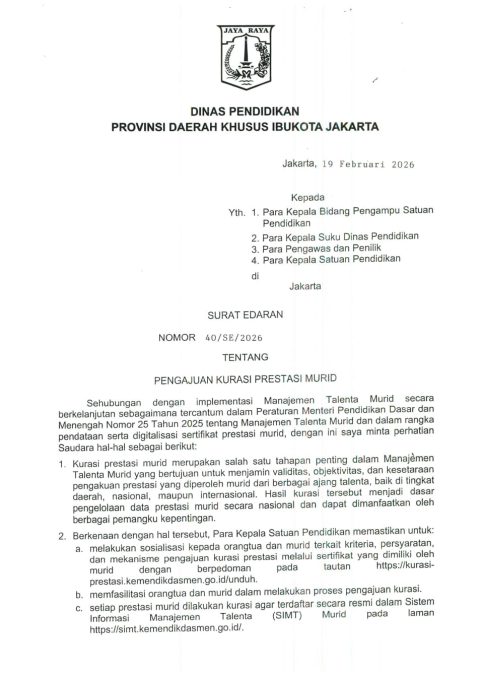 Dinas Pendidikan Provinsi Daerah Khusus Ibukota Jakarta Menerbitkan Surat Edaran Nomor 40/SE/2026 Tentang: Surat Edaran Pengajuan Kurasi Prestasi Murid
